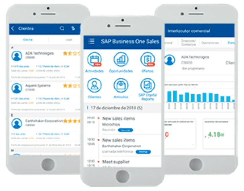 The SAP Business One Mobile Sales application connects remote users to their central SAP Business One ERP and CRM data, allowing them to view information on a mobile device. The functionalities available are: